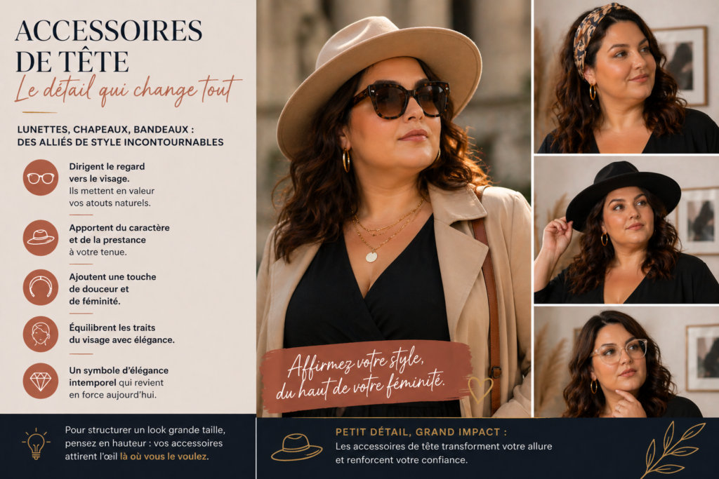 Les accessoires de tête sont souvent sous-estimés alors qu’ils jouent un rôle clé. Lunettes, chapeaux ou bandeaux permettent de diriger le regard vers le visage. Pour accessoiriser une tenue grande taille, ils apportent une dimension supplémentaire. Des lunettes bien choisies peuvent équilibrer les traits du visage. Un chapeau structuré donne du caractère et une certaine prestance. Les bandeaux ou serre-têtes ajoutent une touche de douceur. Dans une approche traditionnelle, le chapeau était un symbole d’élégance incontournable. Aujourd’hui, il revient en force comme un accessoire de style affirmé.