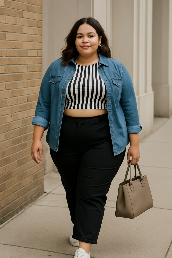 Avec un crop top grande taille, vous pouvez créer des looks très tendances et modernes. Optez pour un modèle à rayures verticales que vous associez à un pantalon taille haute et des sneakers pour un look casual chic. Vous pouvez également jouer sur les superpositions en associant votre crop top à une chemise en jean ou à une blouse légère, qui viendront camoufler subtilement votre ventre.