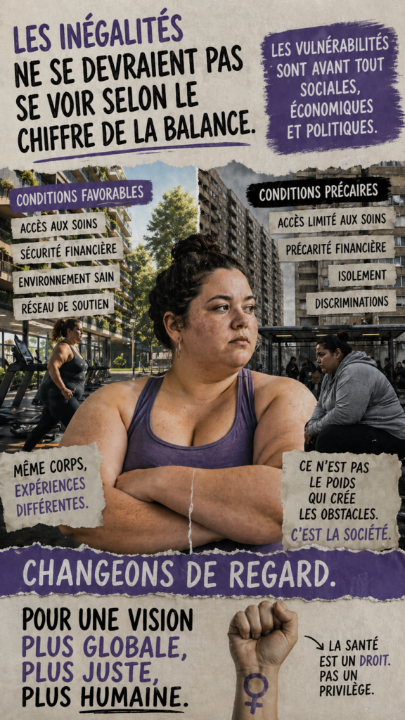 Être une femme grosse ne renvoie pas à la même expérience qu’être un homme. Vivre en situation de précarité transforme profondément le rapport à la santé. Habiter dans une zone rurale éloignée des soins complique encore davantage l’accès aux services médicaux. Être parent isolé ajoute une pression supplémentaire.