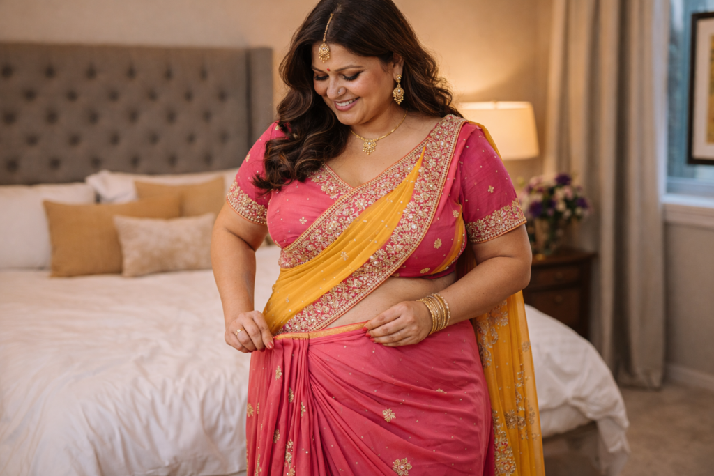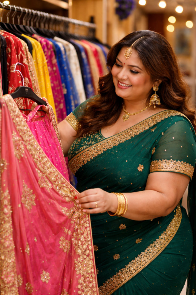 Un choli mal ajusté peut déséquilibrer toute la tenue. À l’inverse, un choli bien coupé transforme immédiatement l’allure. Pour une femme ronde, il est essentiel de choisir une coupe qui soutient, structure et valorise.