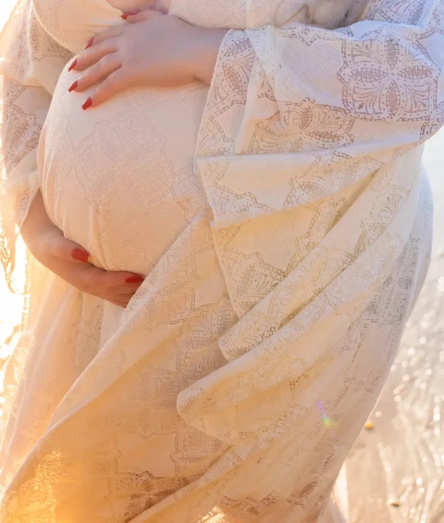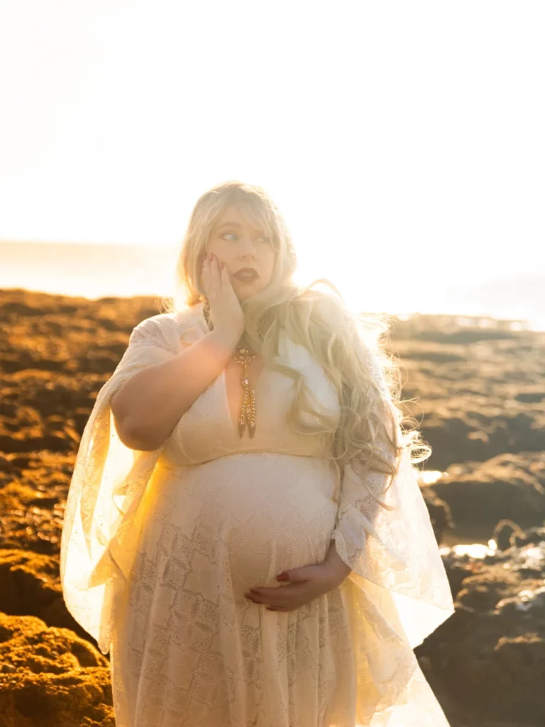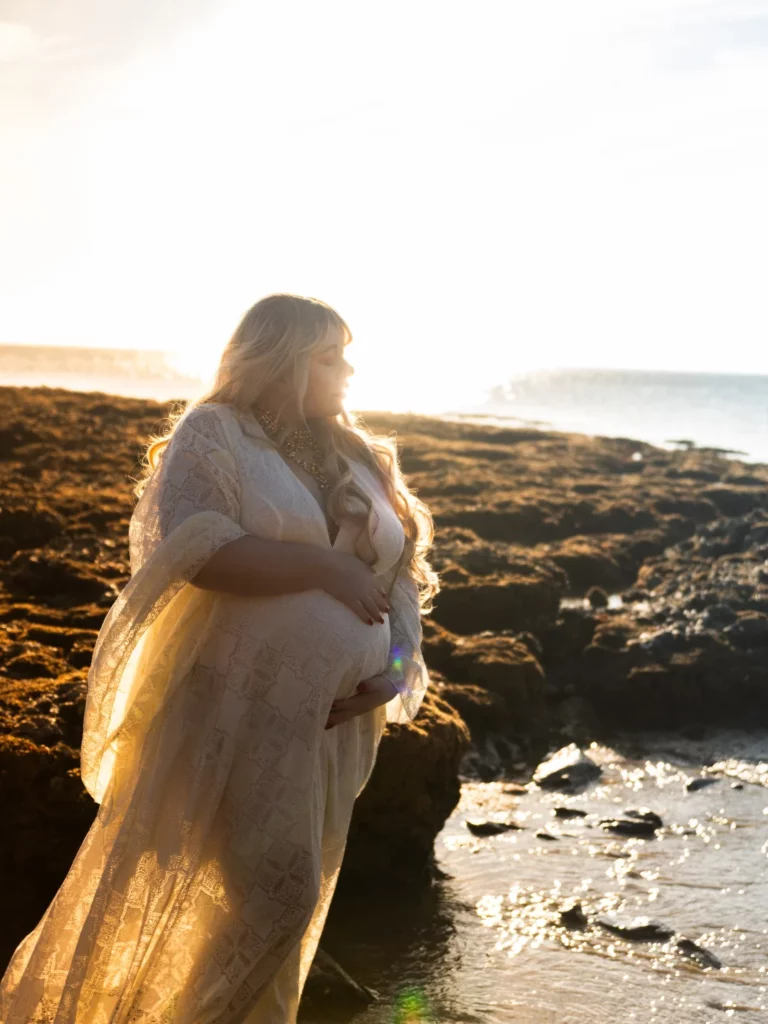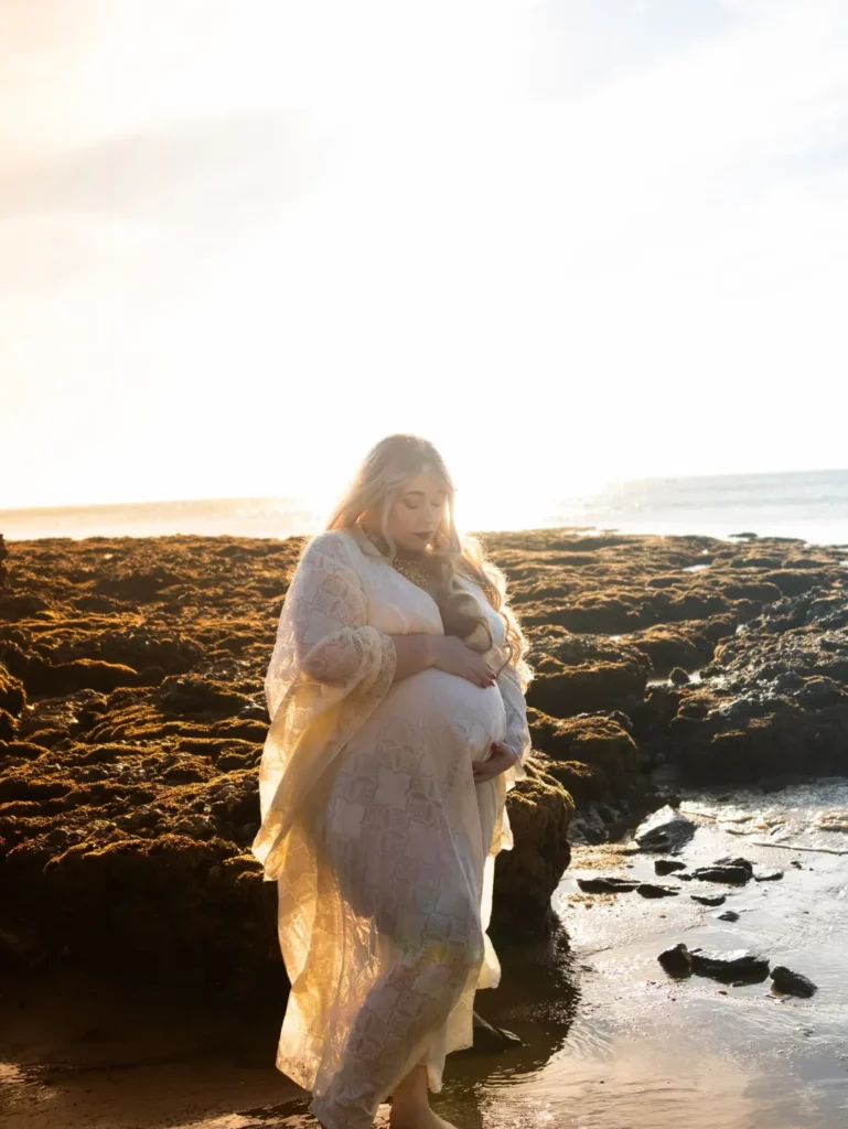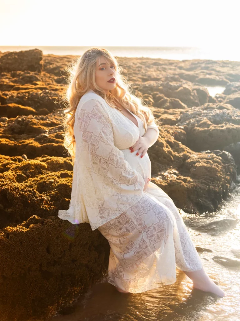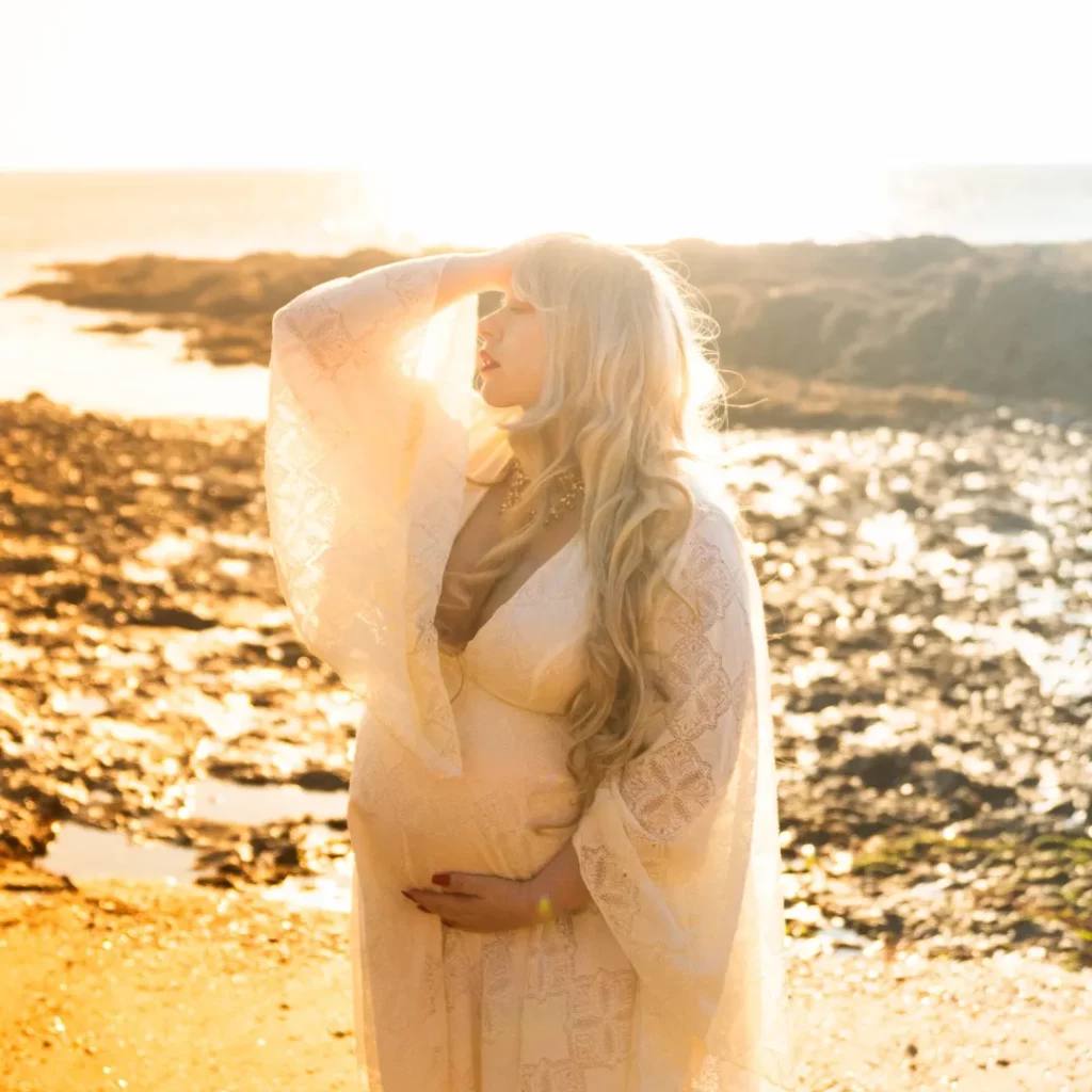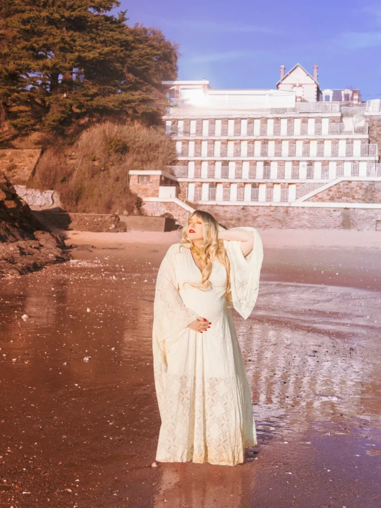 Pour ce shooting grossesse à la plage, le choix de la tenue était essentiel. Il ne s’agissait pas uniquement d’un parti pris esthétique, mais d’une véritable cohérence avec le lieu et la lumière. J’ai choisi une robe brodée fluide ainsi qu’un collier provenant de Shein. La matière légère capte subtilement la lumière naturelle et laisse passer les reflets dorés du soleil couchant. Les broderies apportent une texture délicate qui dialogue avec les reliefs minéraux des rochers et le mouvement de l’eau.