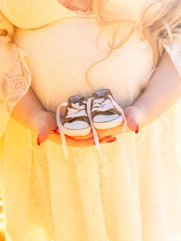 Nous avions également imaginé apporter des accessoires symboliques, comme un body et des chaussures de bébé. Ces éléments permettent de matérialiser l’attente, de rendre l’arrivée de l’enfant plus tangible. Ils créent un lien direct entre le présent du corps qui porte et l’avenir qui se dessine.