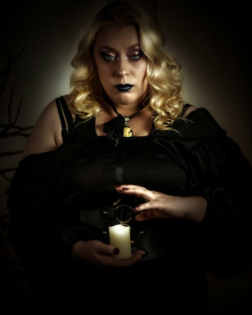 Lors de mon shooting “sorcière sombre”, une simple bougie LED et un angle serré ont suffi à créer une scène envoûtante. Comme quoi, la lumière est un sort puissant à elle seule.